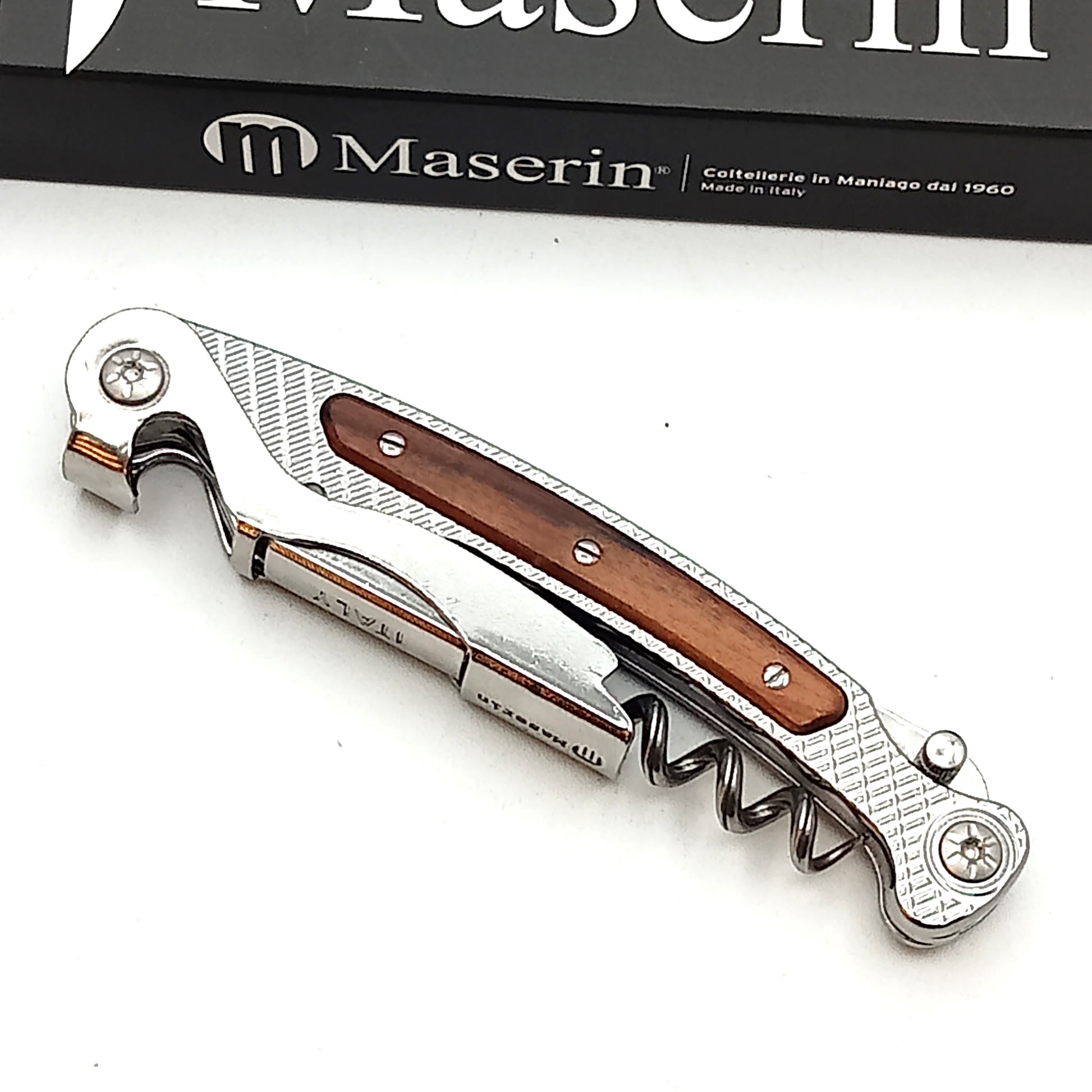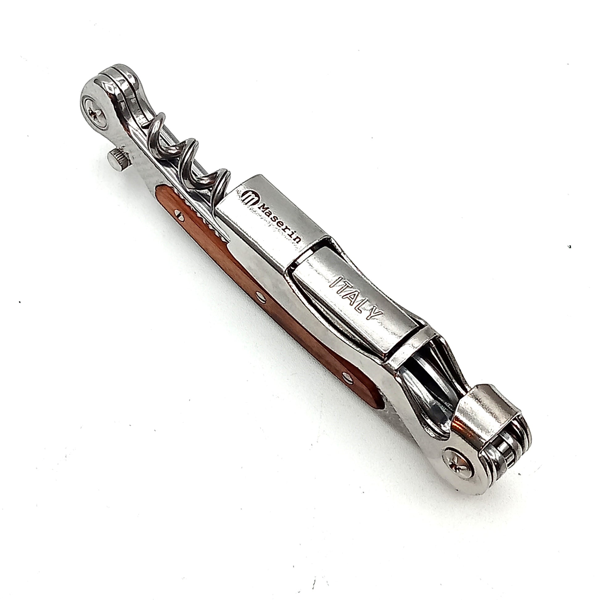 Cavatappi per Somelier della Maserin costruito interamente in acciaio inox con elegante inserto in legno.