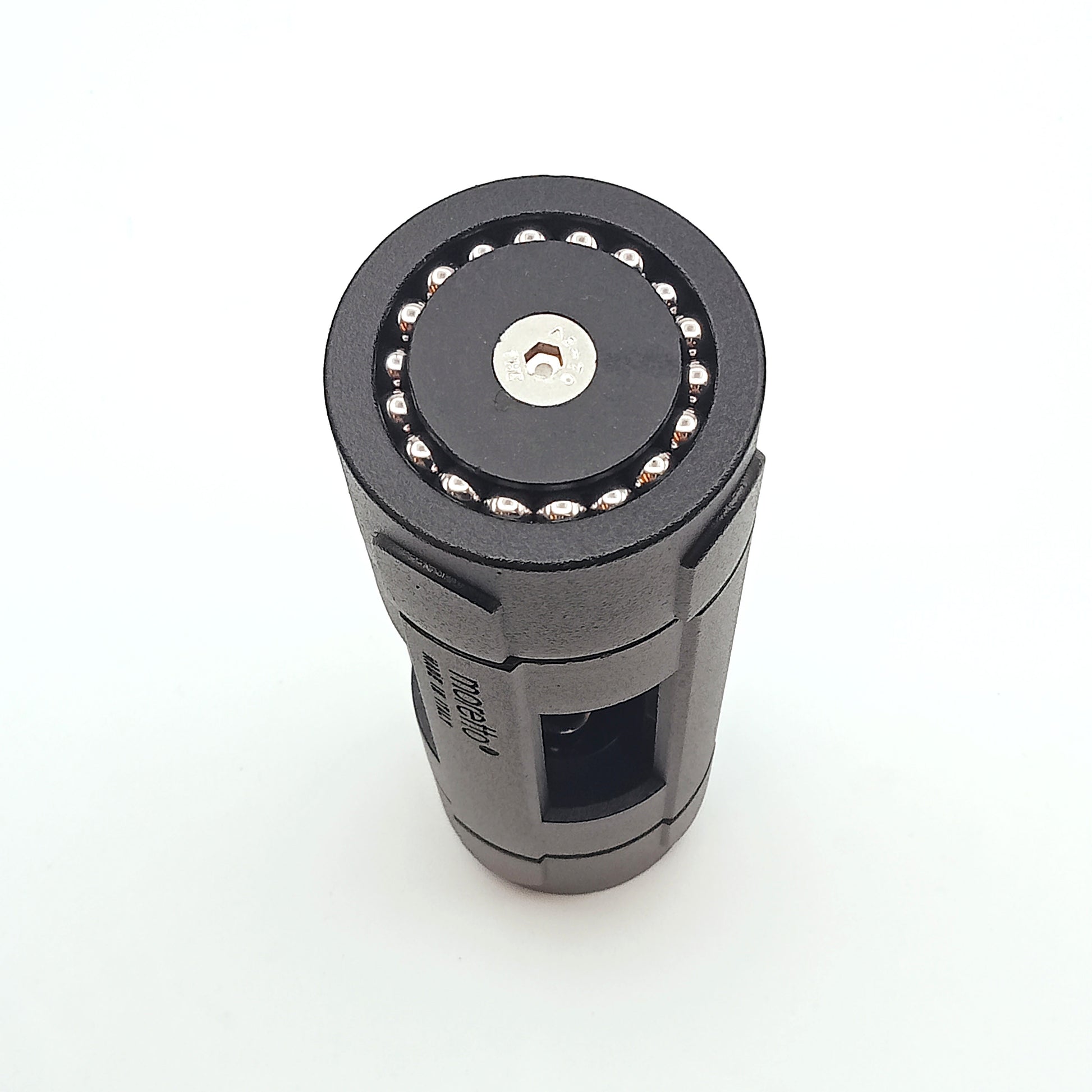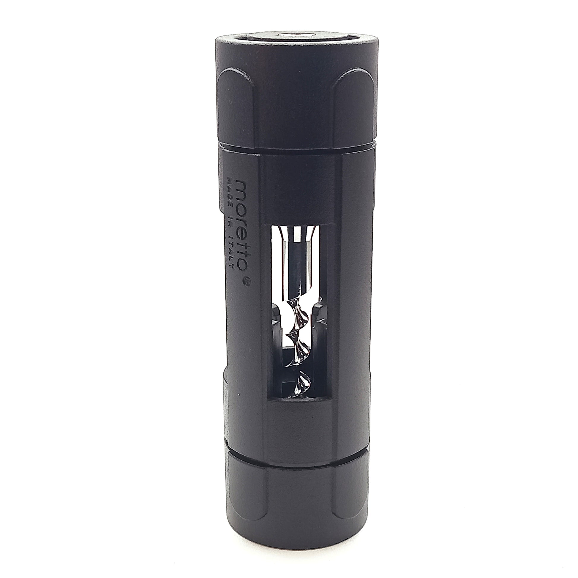 Cavatappi costruito dalla Moretto in alluminio con verniciatura nera. Disegno moderno, ha una base per appoggiarlo, il verme è azionato dal cuscinetto che si intravvede sulla testa che assicura un movimento fluido e senza sforzo, accompagnato da una elegante confezione in latta