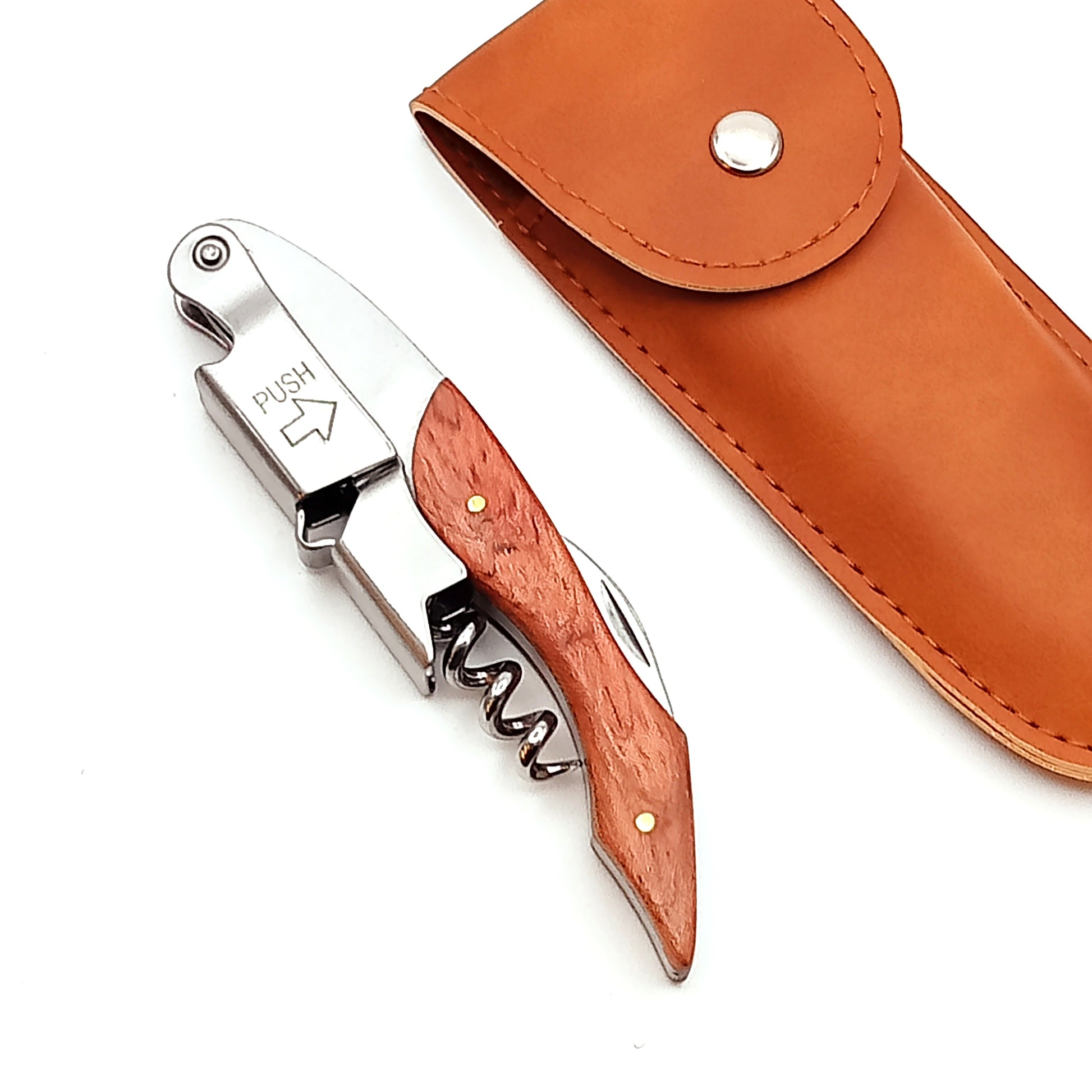 Cavatappi da Somelier con doppia leva per l'estrazione in due fasi del tappo, verme robusto di tipo moderno molto penetrante, lama dentata per togliere la stagnola, costruito in acciaio inox con manico in legno e fornito con elegante fodero in pelle.