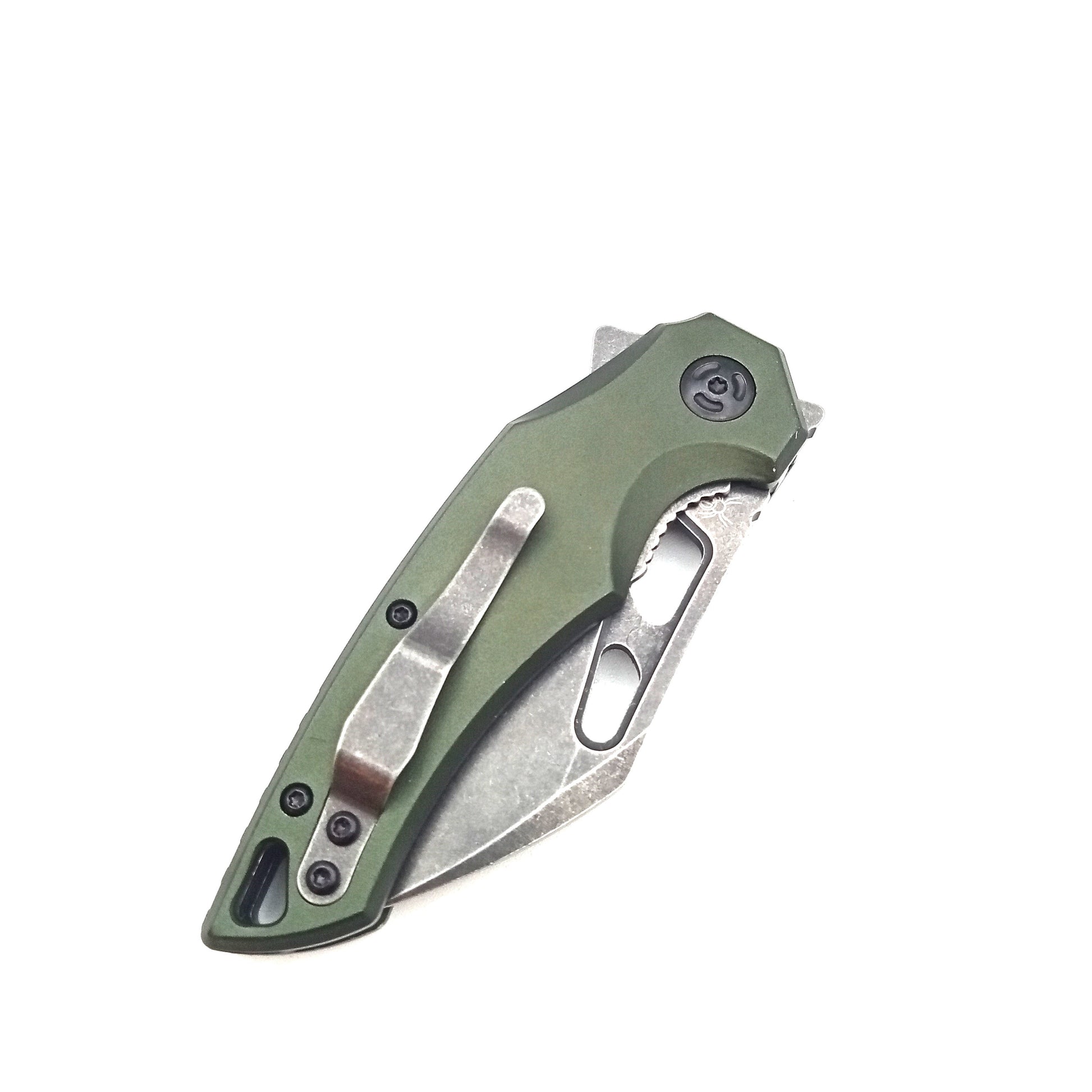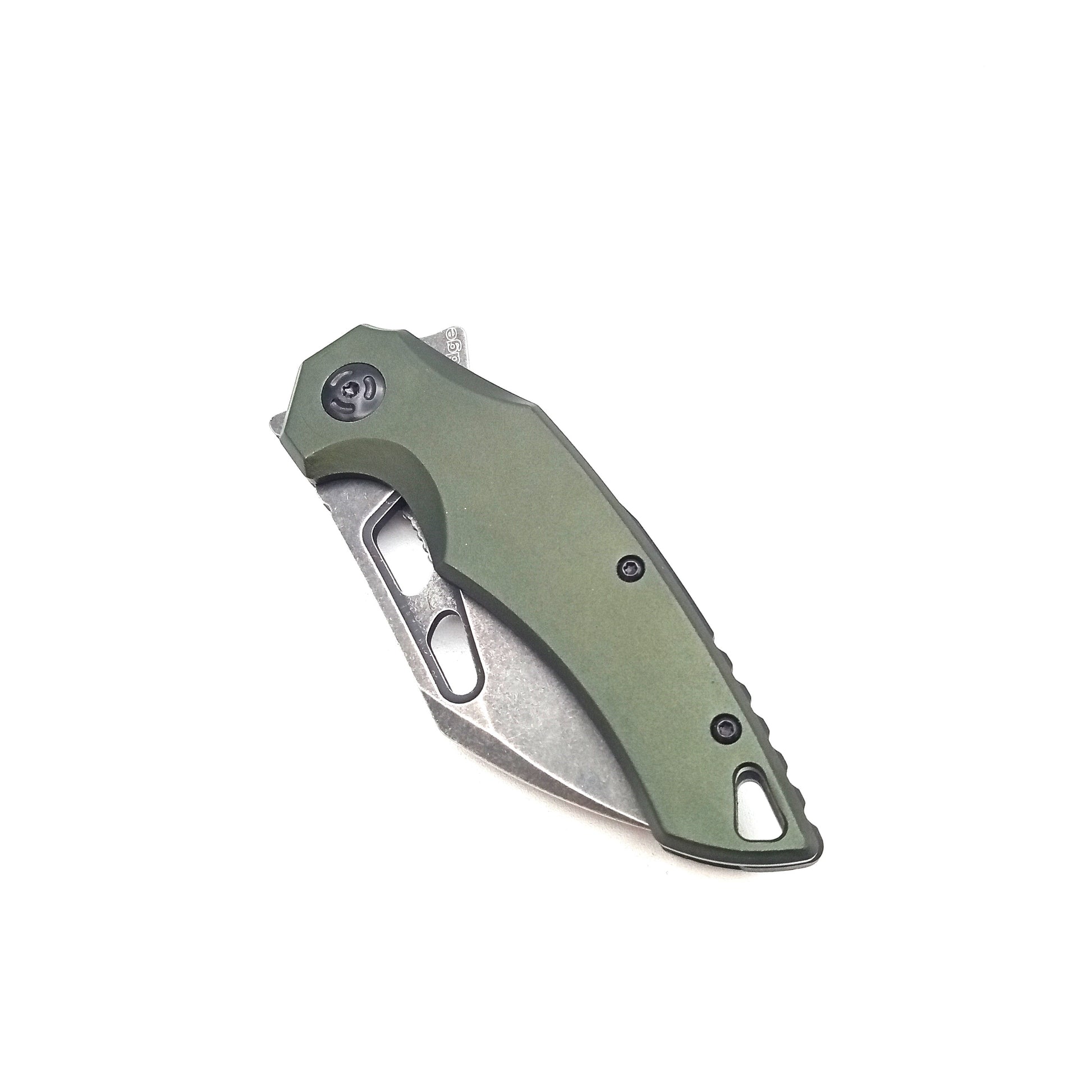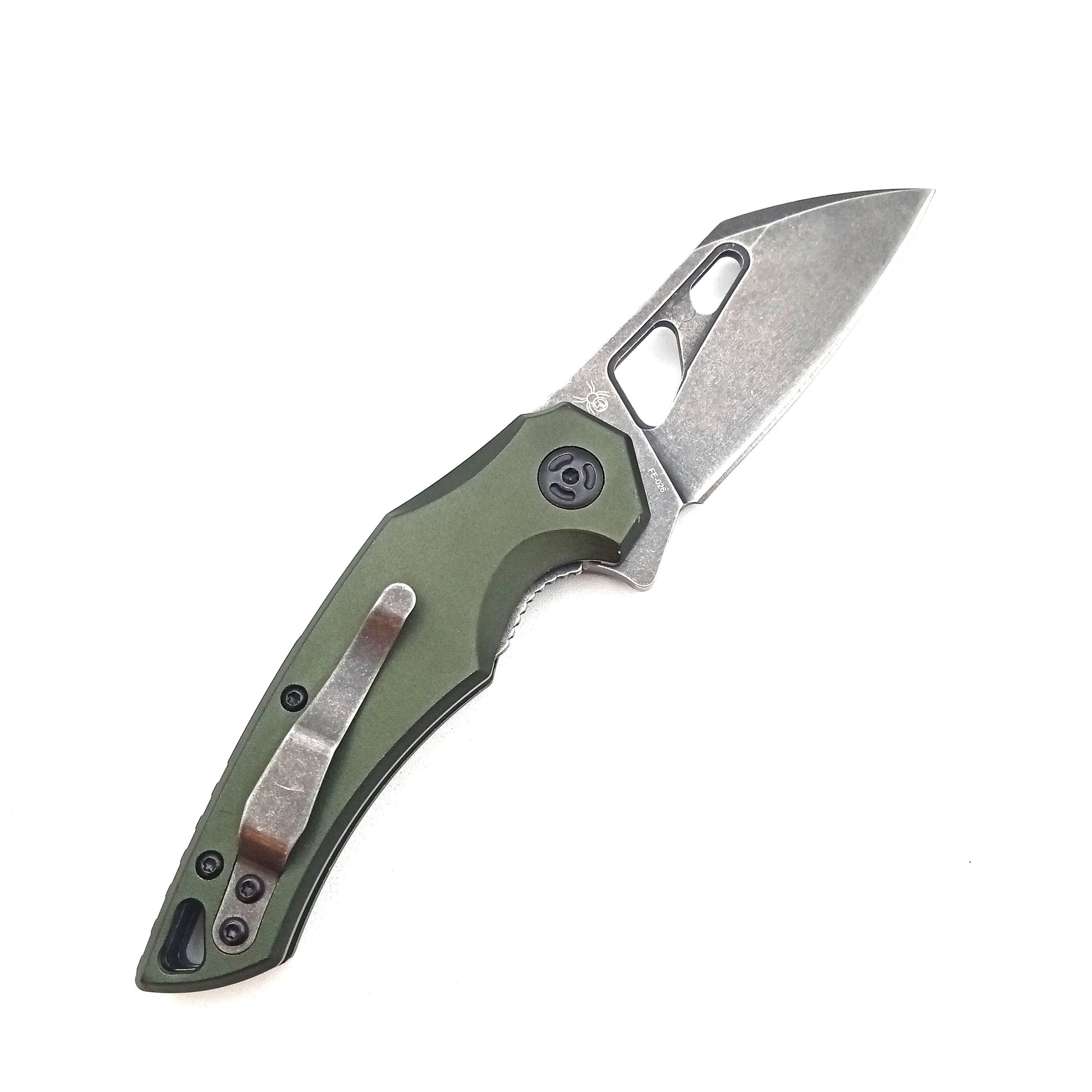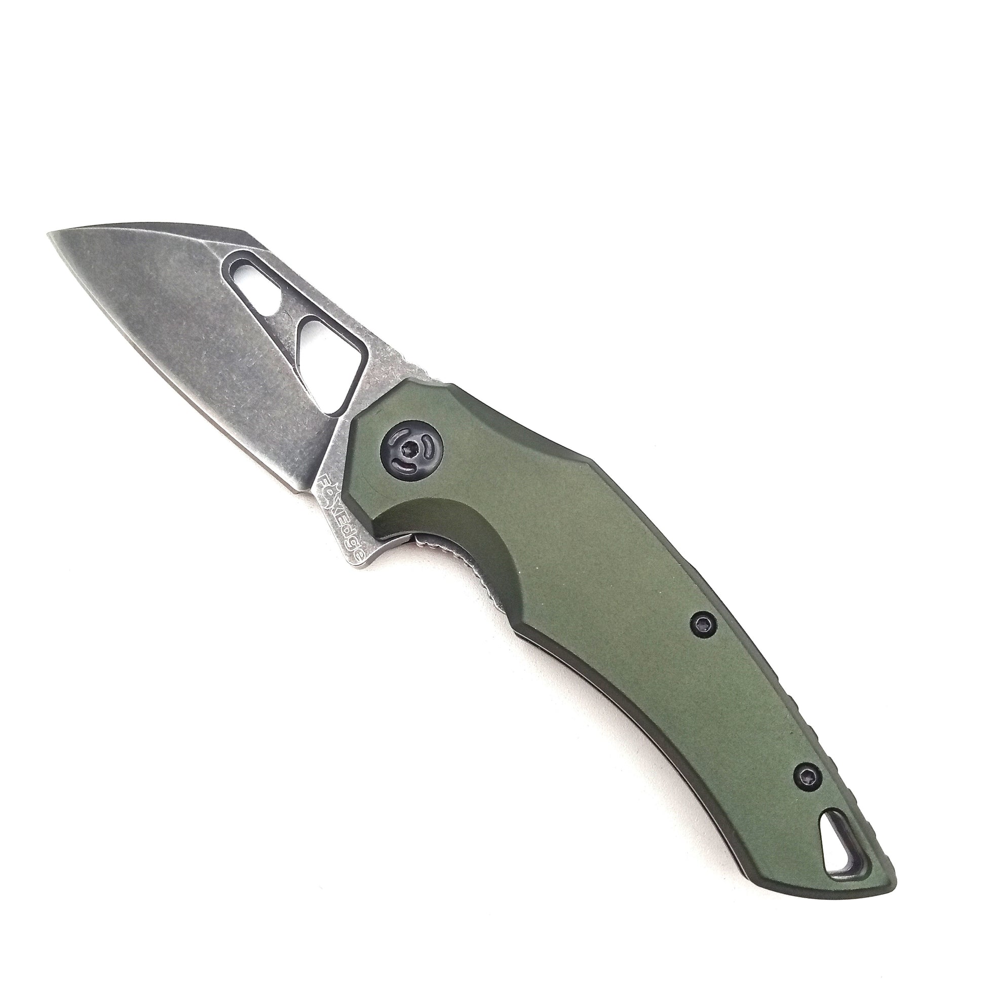 Coltello della linea FoxEdge con lama in acciaio inox 8Cr13MOV con finitura stone washed, manico in alluminio colore verde OD, munito di clip per il trasporto