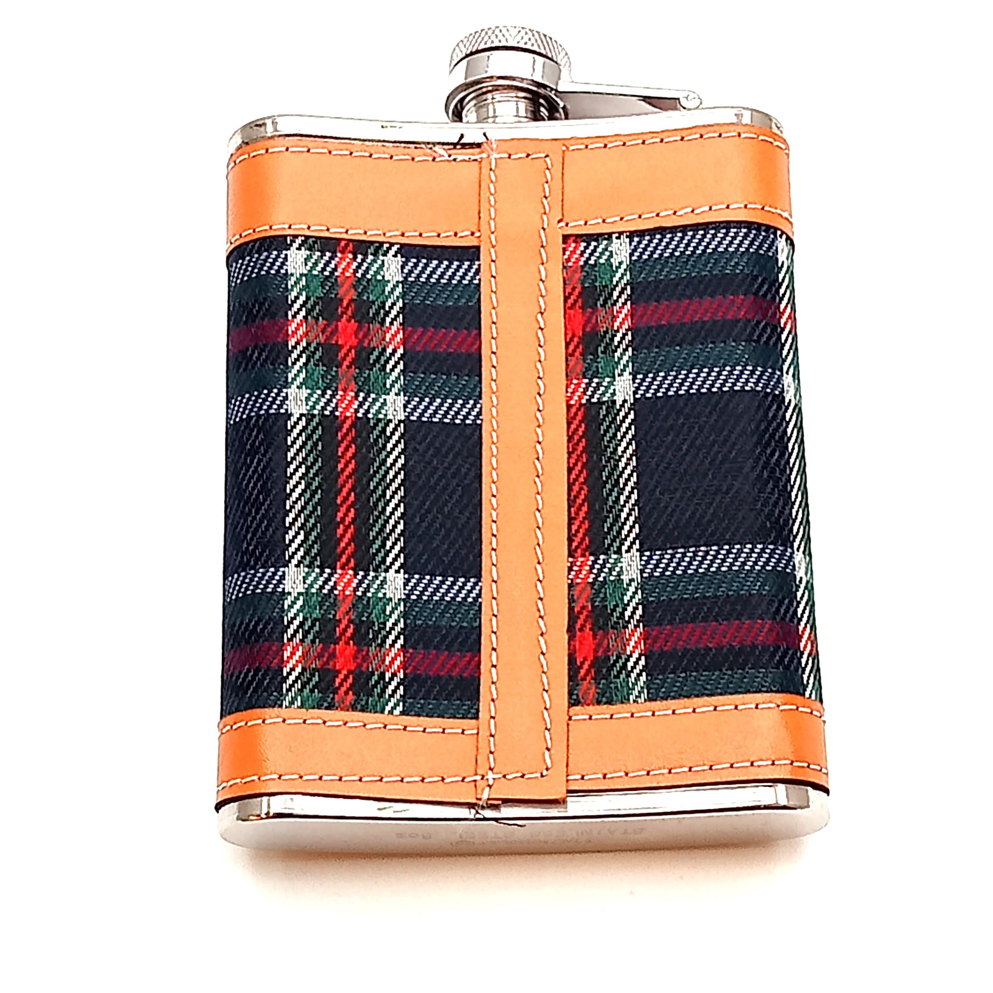 Fiaschetta contenitore per liquidi, alcolici e superalcolici, costruita in acciaio inox con ricopertura in tessuto scozzese e pelle, tappo anticaduta ermetico. Ideale per escursioni al freddo o sulla neve. Nella scatola è incluso un imbuto in acciaio inox per il riempimento.