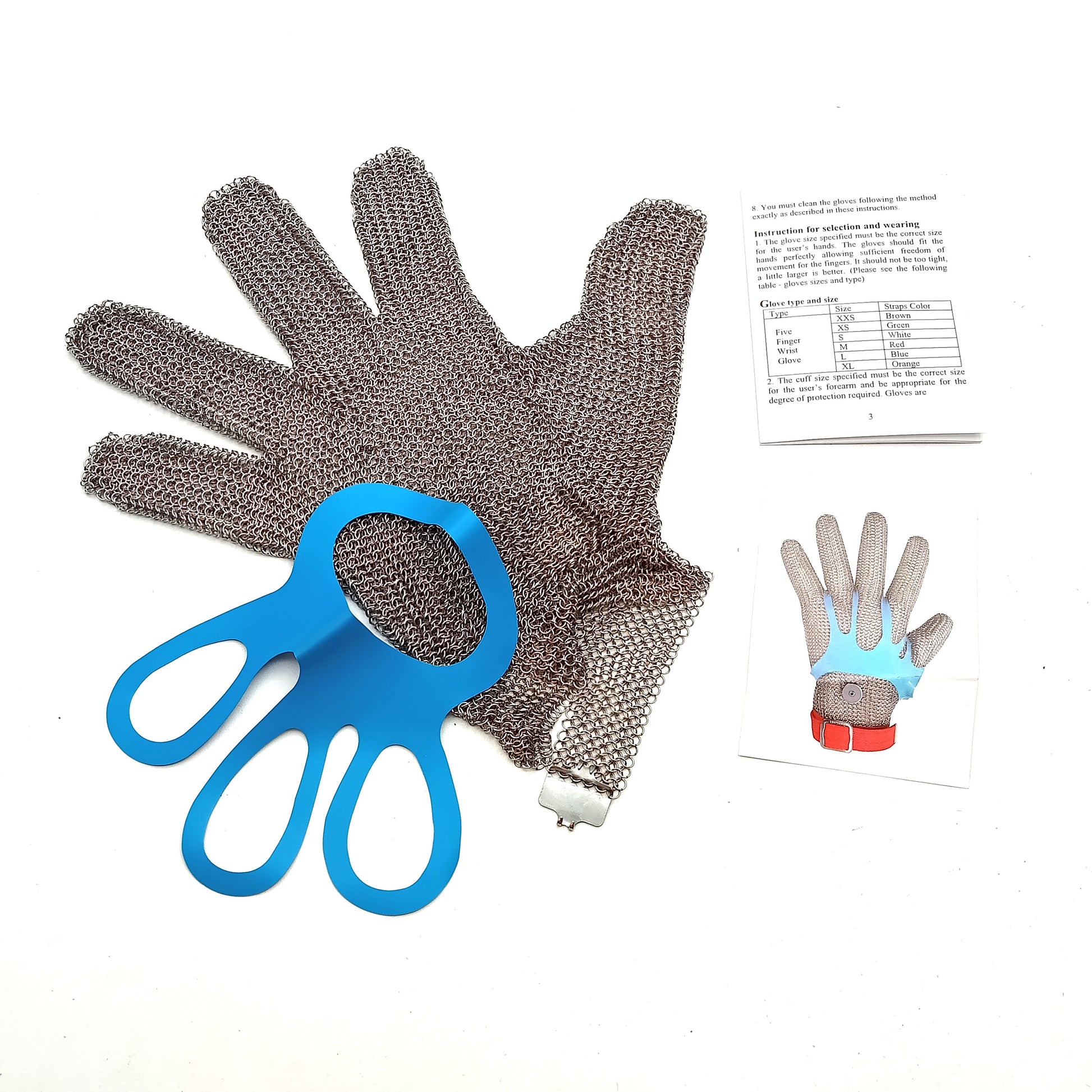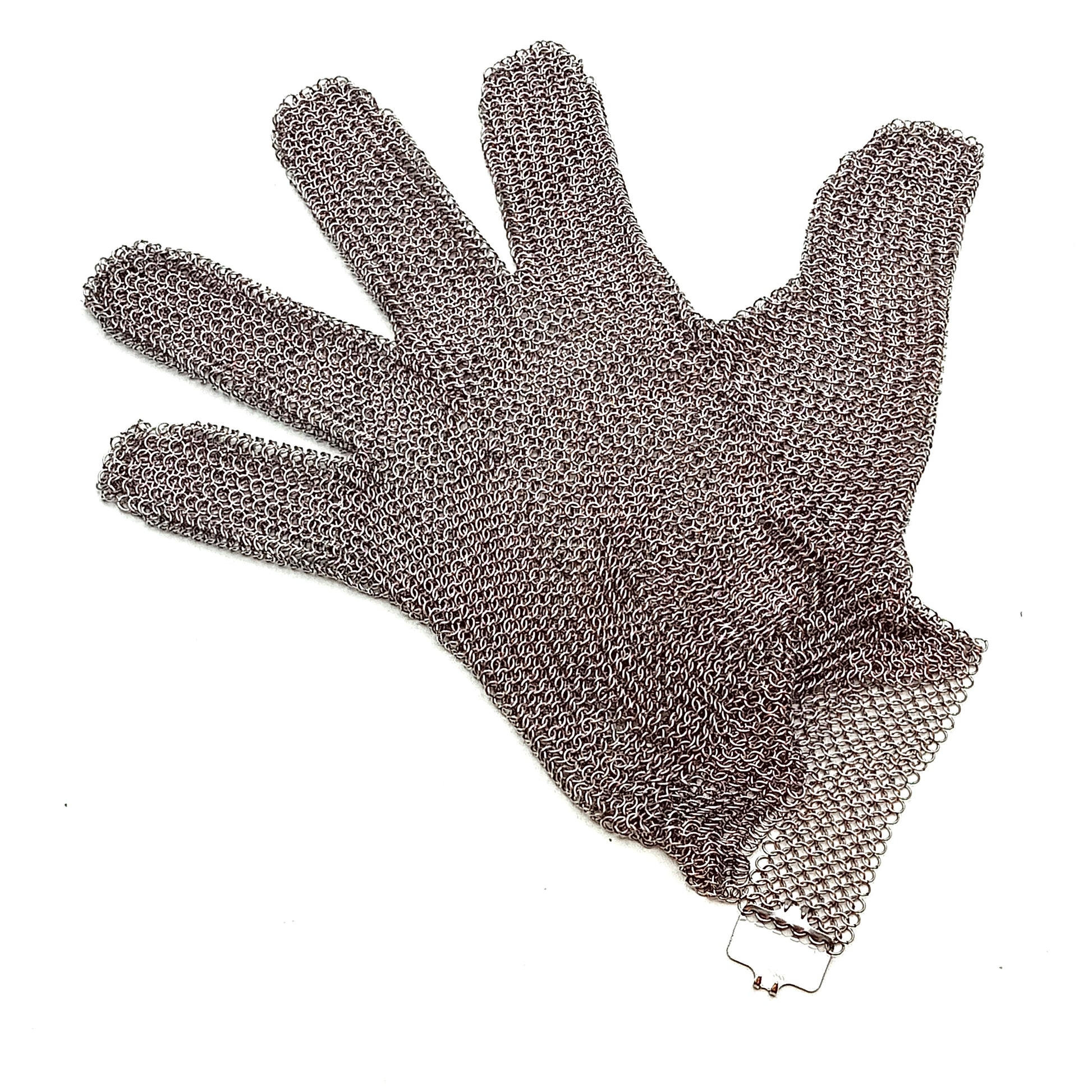 Guanto singolo per la protezione da tagli della mano debole (che non impugna il coltello), formato da maglia in acciaio inox, adatta sia per mano destra che sinistra, dotato di gancio regolabile al polso.