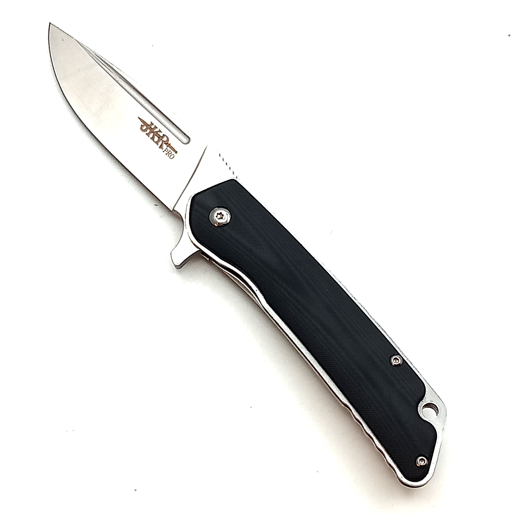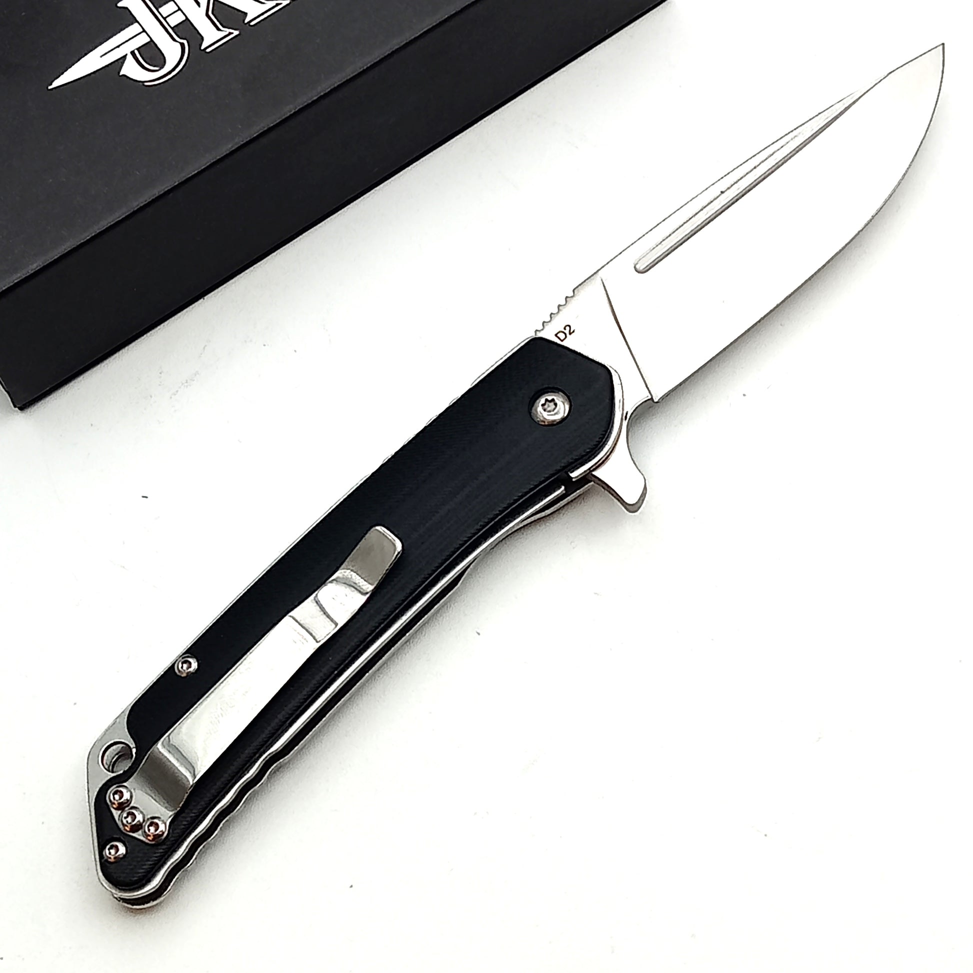 Coltello della JKR con lama in acciaio D2, manico in G10, ritenzione della lama con sistema liner-lock, fornito con una scatolina in cartone nero