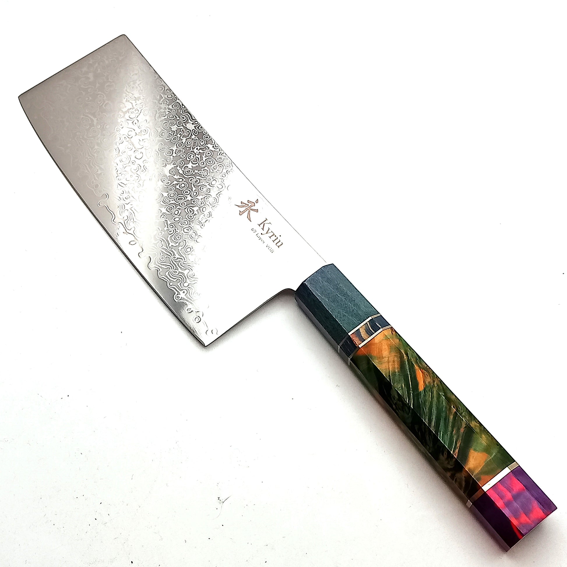 Coltello modello cinese con lama in damasco 67 strati e filo in VG8, manico in legno colorato. E' il coltello universale cinese, equivalente ad un santoku o trinciante, adatto a tagliare verdura, carne e pesce. Fornito con scatola in cartone nero con interni rossi.