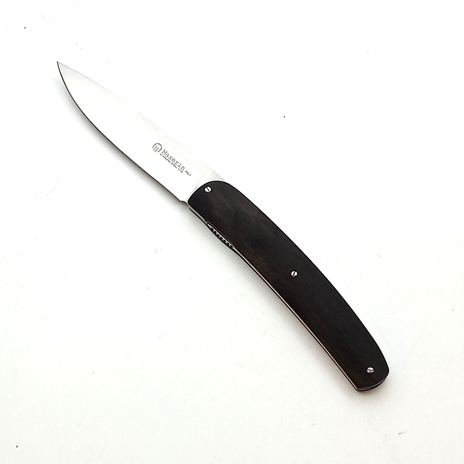 Coltello molto elegante con lama in acciaio inox 4116, manico in essenza di legno di ebano, è dotato di un sistema liner-lock contro la chiusura accidentale della lama.