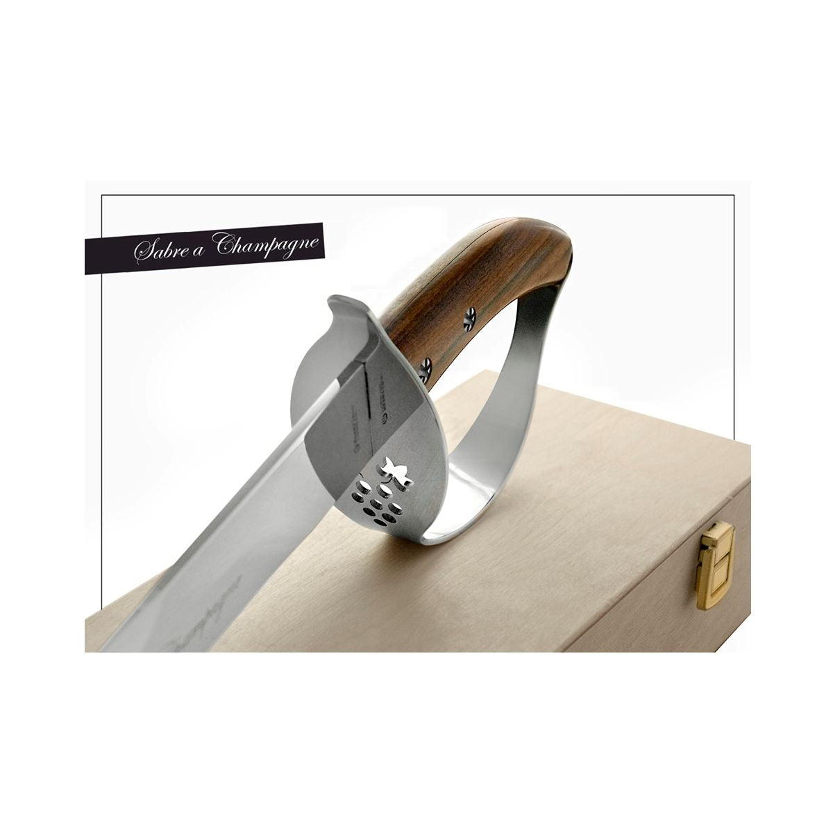 Elegante sciabola per stappare le bottiglie di spumante o champagne, la lama è in acciaio inox, il bel manico è in metallo e legno di rovere. Il tutto è completato da una scatola in legno. All'interno ci sono le istruzioni su come eseguire l'operazione di stappaggio. La lama non è affilata.