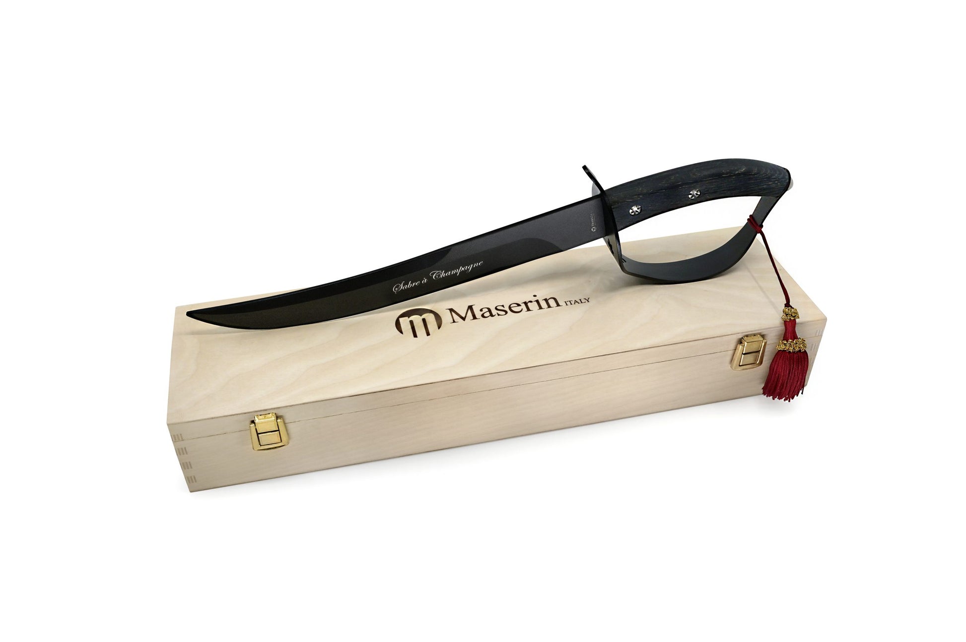 Elegante sciabola per stappare le bottiglie di spumante o champagne, la lama è in acciaio inox con finitura nera, il bel manico con elsa in metallo e legno nero . Il tutto è completato da una scatola in legno. All'interno ci sono le istruzioni su come eseguire l'operazione di stappaggio. La lama non è affilata.