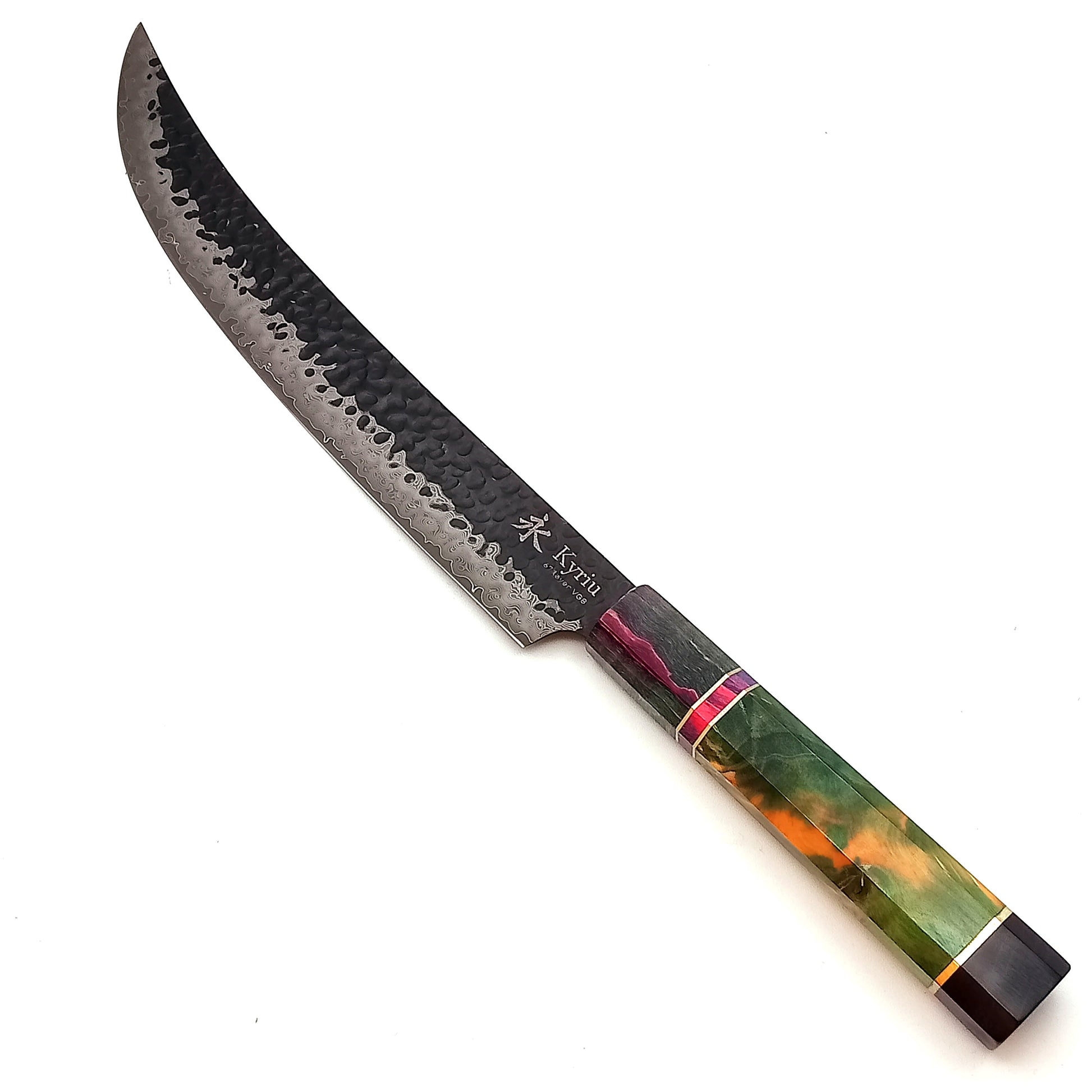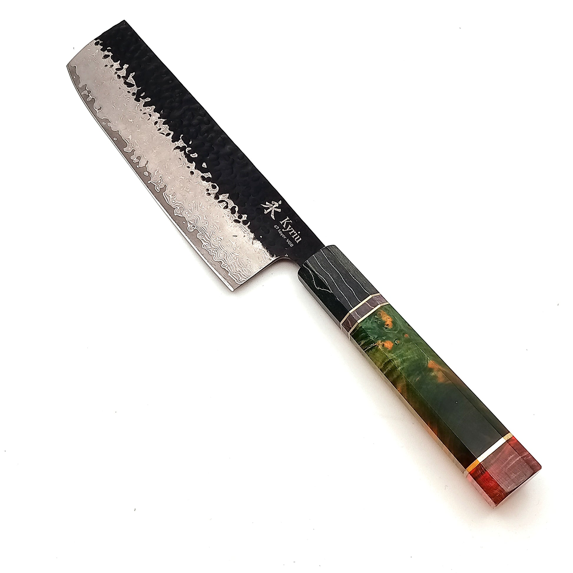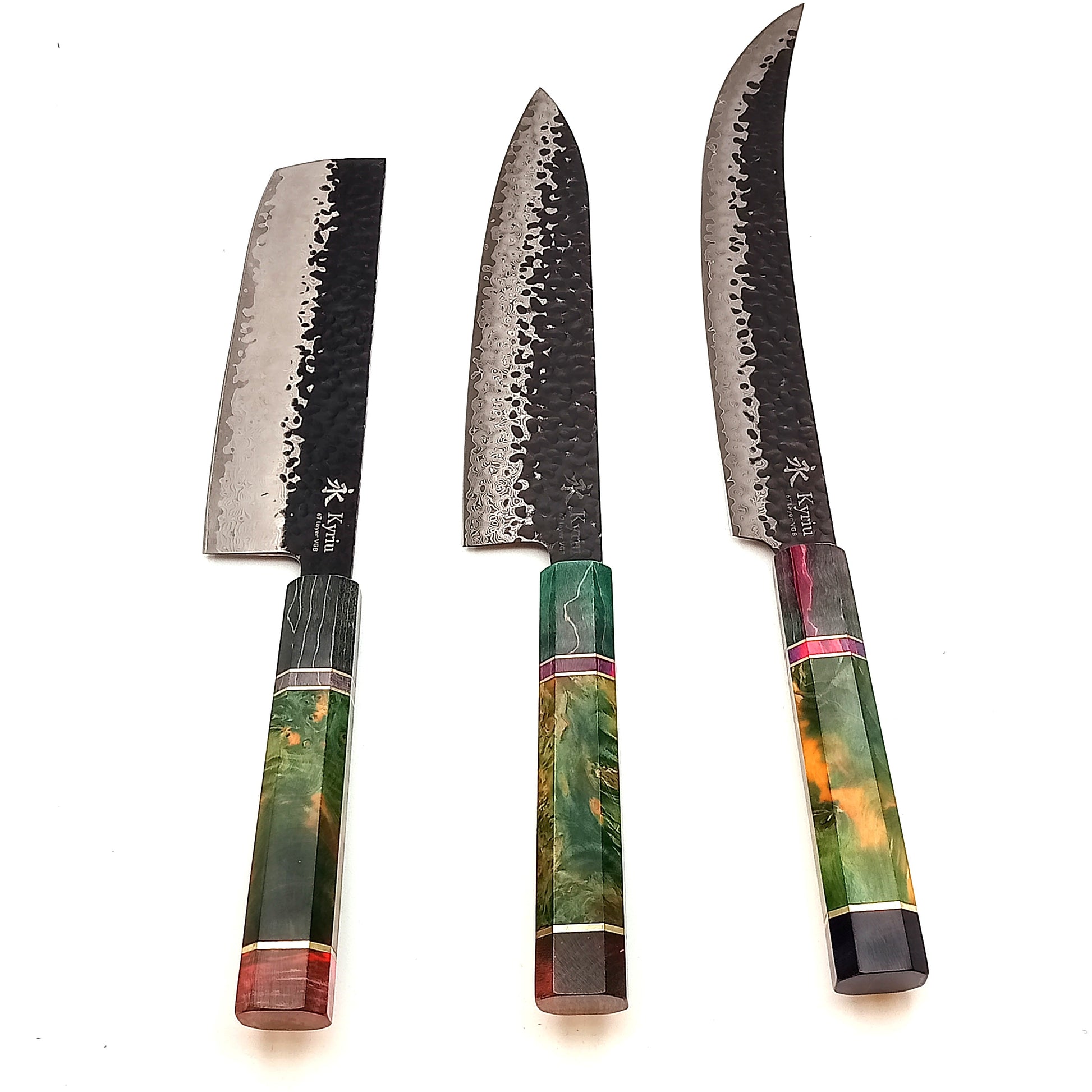 Set di 3 pezzi di coltelli Kyriu della serie Korouchi con lama in damasco 67 strati e manico ottagonale in legno colorato. Il set è composto da: