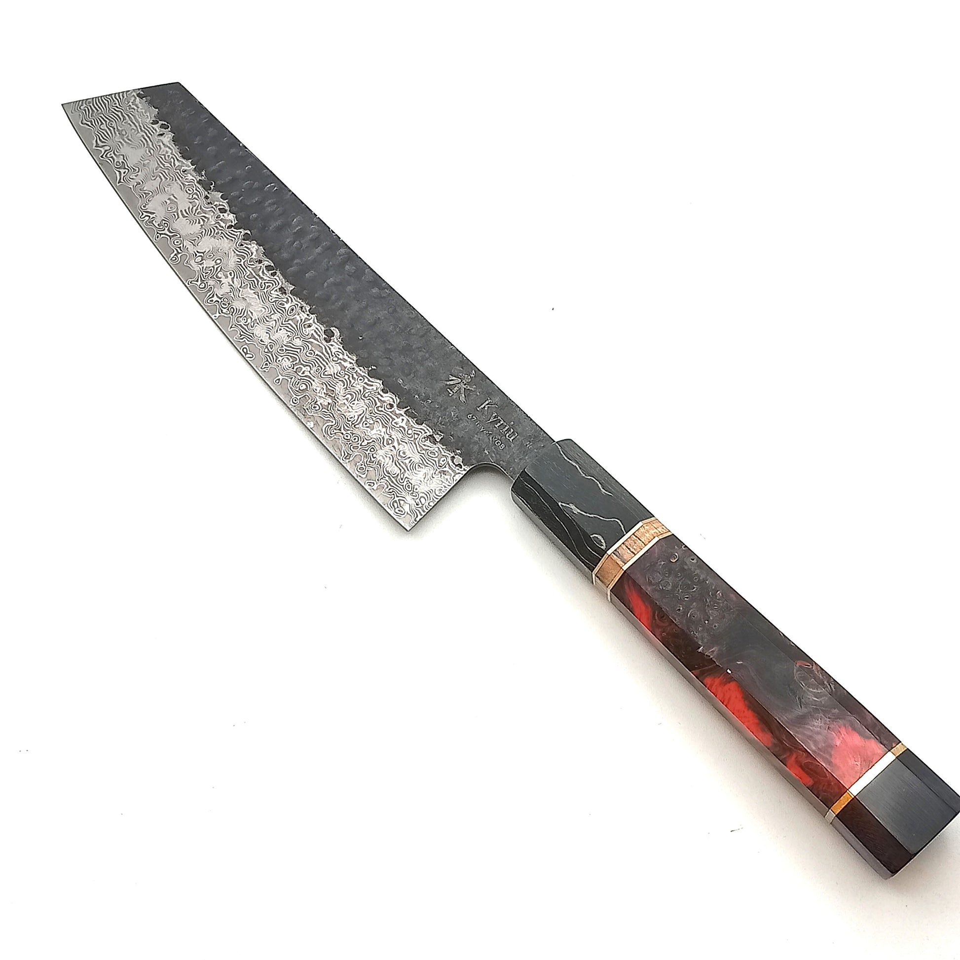 Set di quattro pezzi di coltelli Kyriu della serie Korouchi con lama in damasco 67 strati e manico ottagonale in legno colorato. Il set è composto da: